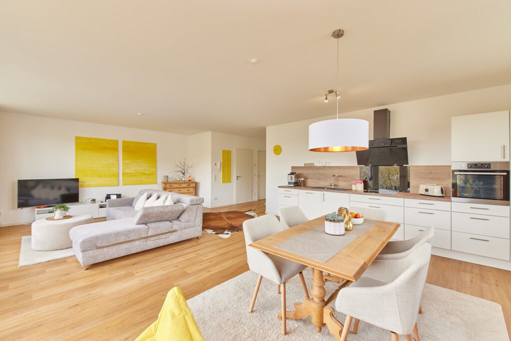 Der gesamte Grundriss ist modern und luftig. Die Deckenhöhe von 3 Meter und die bodentiefen Panoramafenster gestalten die 95qm als wahres Raumwunder.