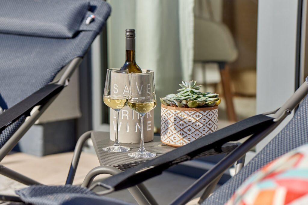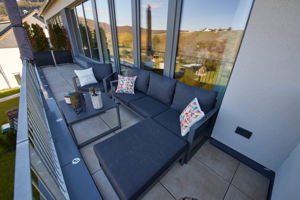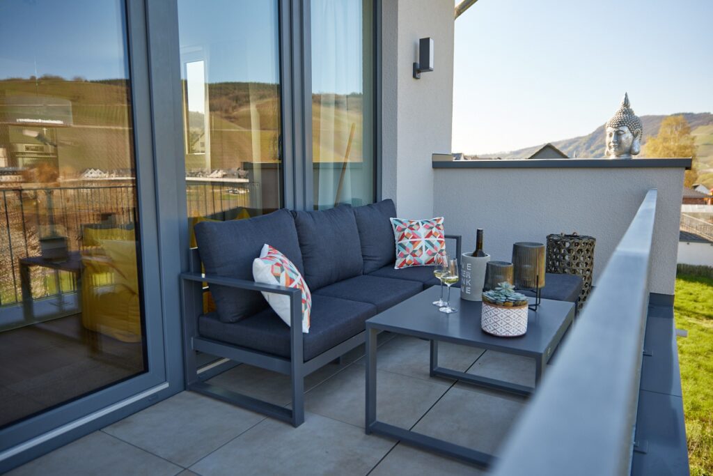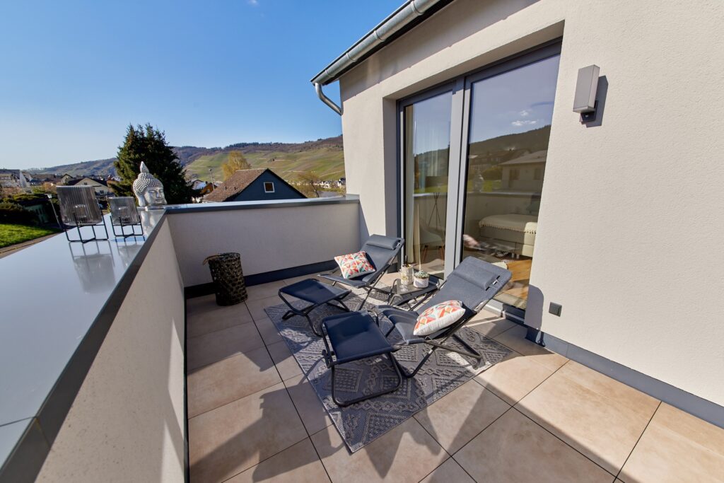 Die 15qm große Terrasse in Richtung Süden ist mit bequemen Liegen ausgestattet. Besonders im Frühjahr und Herbst können Sie hier die Seele baumeln lassen. Die 20qm große Terrasse in Richtung Mosel lädt zu jeder Tages- und Nacht Zeit ein, ein Glas Moselwein auf der Lounge zu genießen.