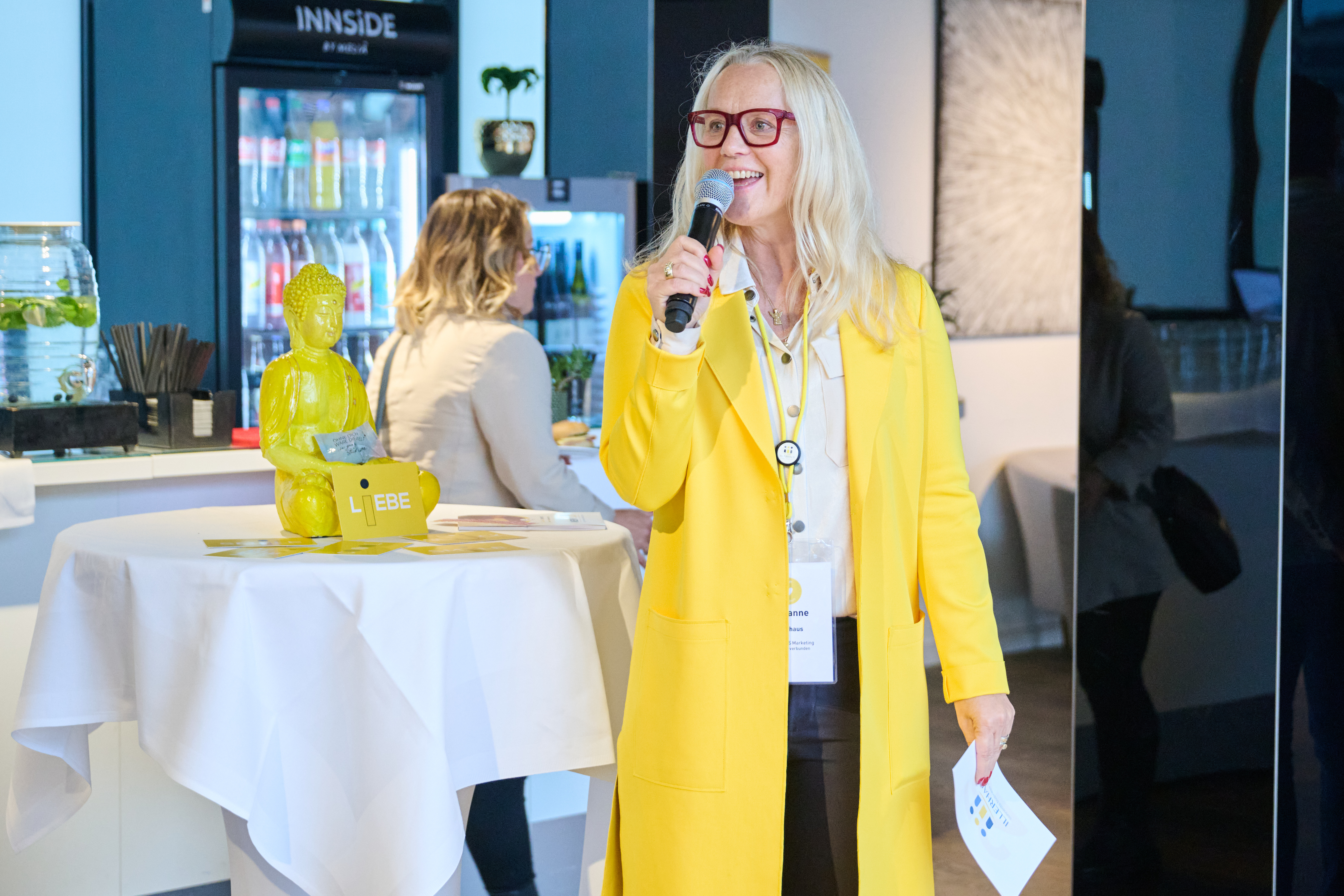 Susanne Illerhaus begrĂŒĂt alle GĂ€ste und stellt die Aussteller vor â Deine ersten Netzwerkpartner warten schon! âšđ€