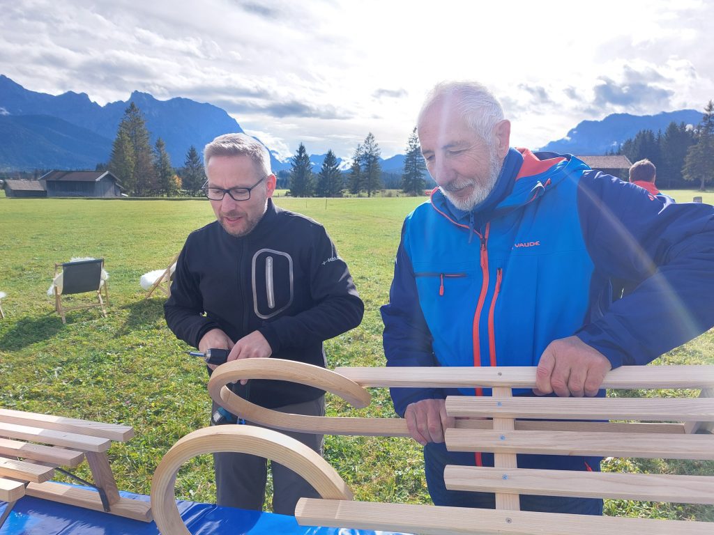 Unser Outdoorprogramm mit Alpin Convention war nicht nur lehrreich, sondern auch ein Geschenk an die Gemeinschaft. Kräuterfee Ursula brachte uns bei einem Spaziergang die Welt der Kräuter näher – eine Erfahrung, die Augen und Sinne öffnete. Danach hieß es: Teamgeist beweisen! Acht Teams bauten Schlitten, die wir voller Freude an den Kindergarten Wallgau übergaben. Die leuchtenden Kinderaugen werden wir wohl nie vergessen.